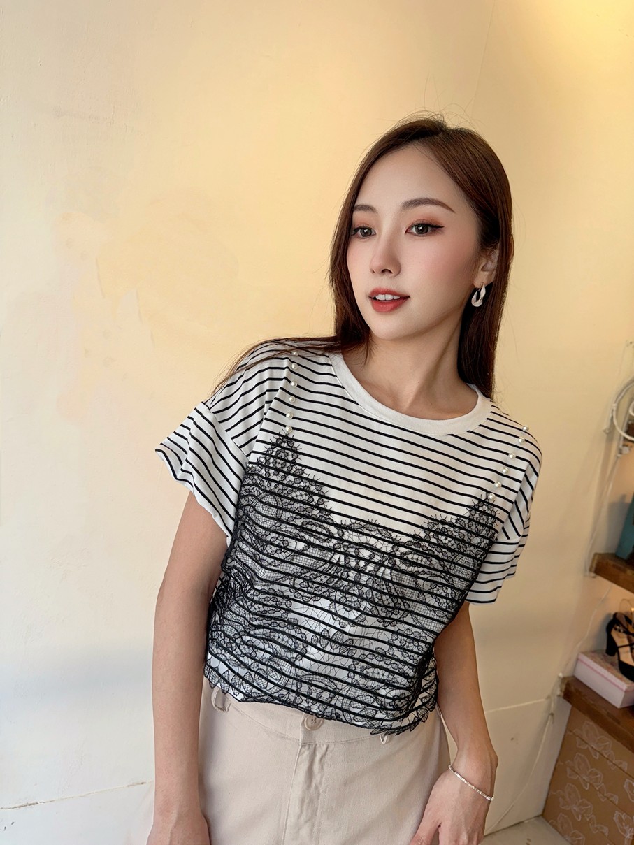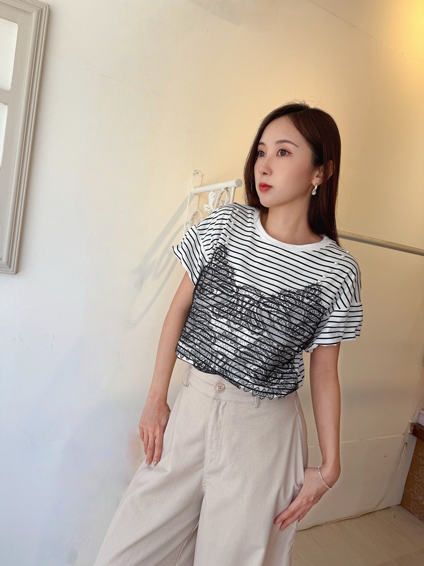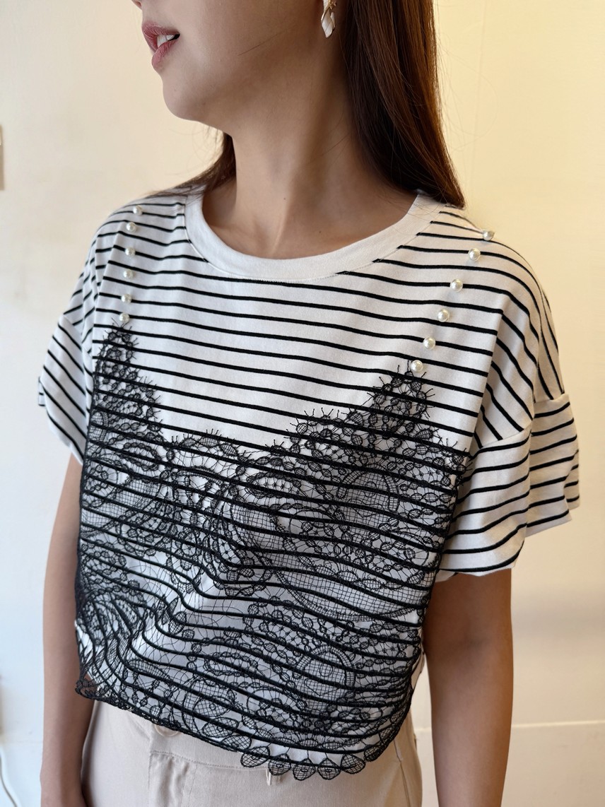 橫條紋珍珠造型吊帶拼蕾絲棉T