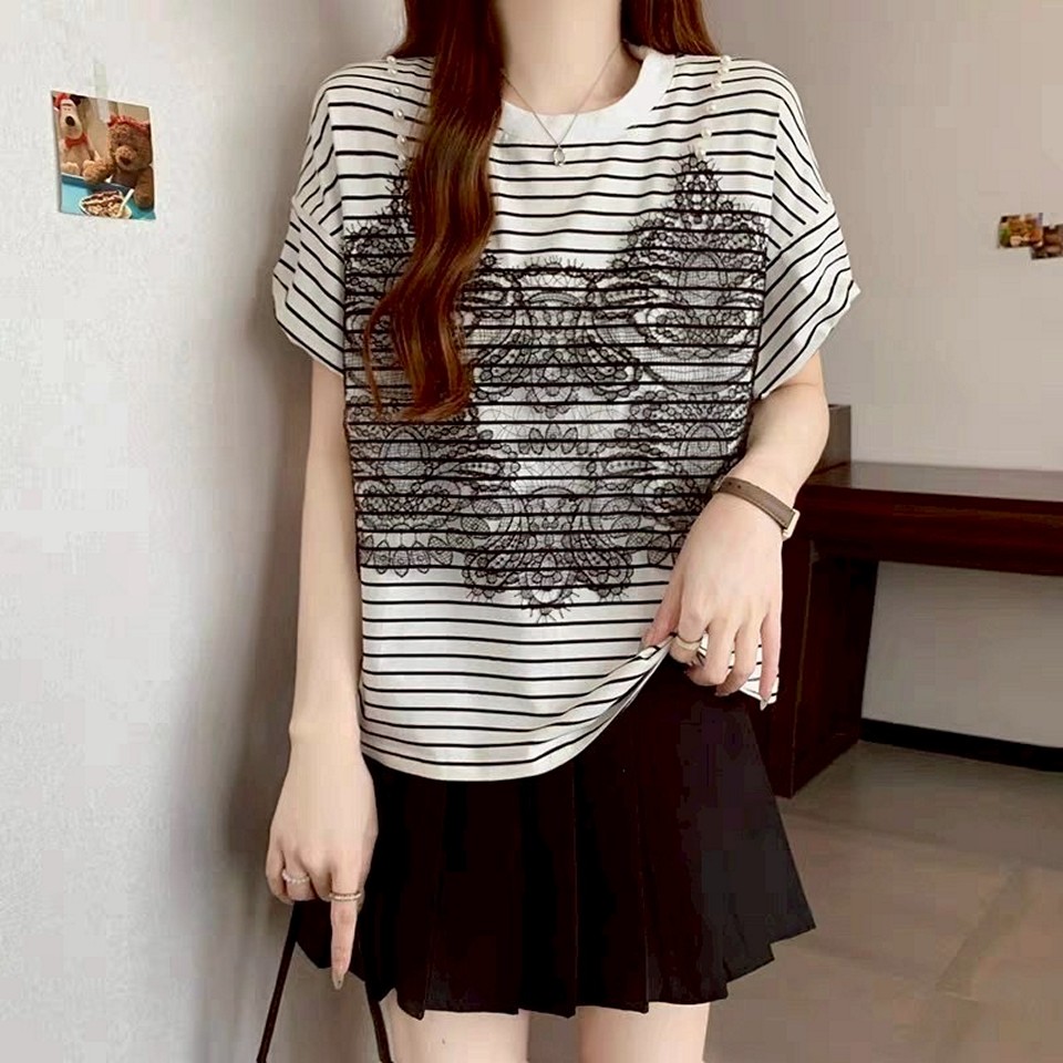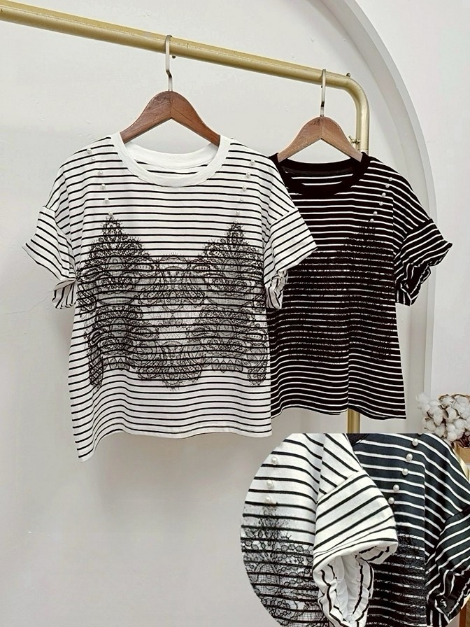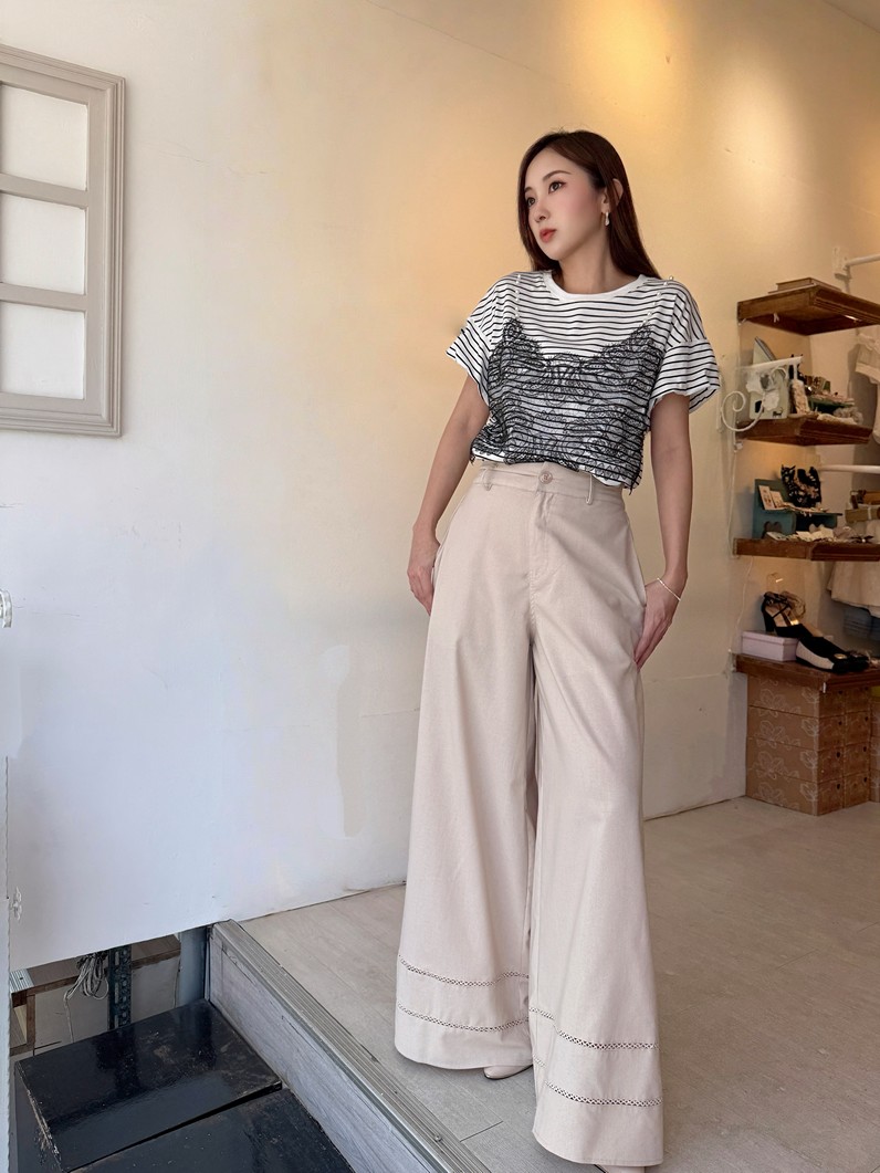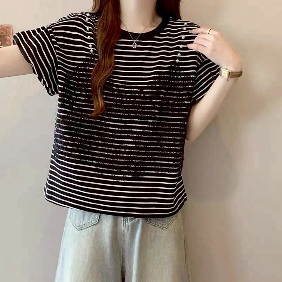橫條紋珍珠造型吊帶拼蕾絲棉T