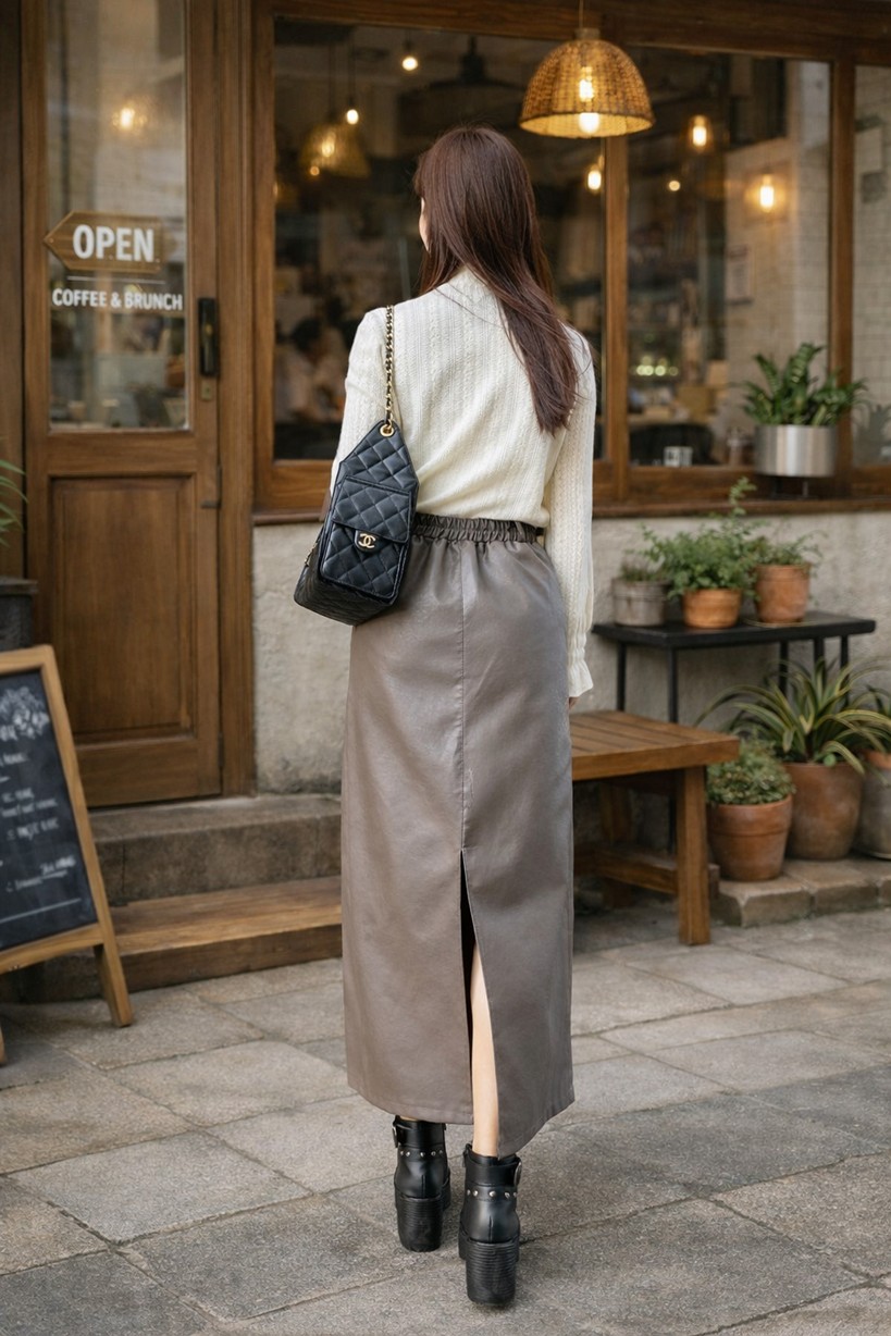 後開岔直筒皮長裙