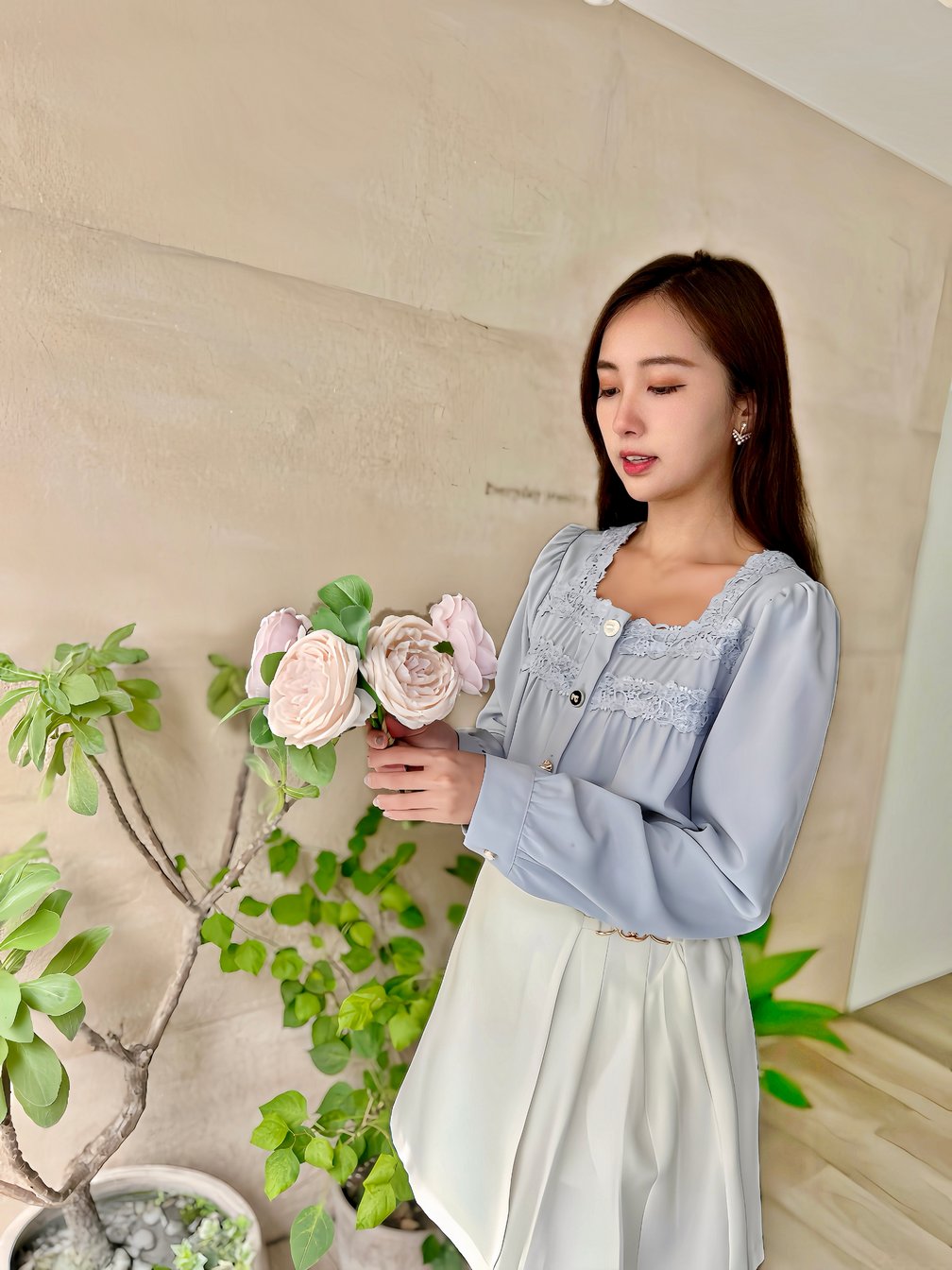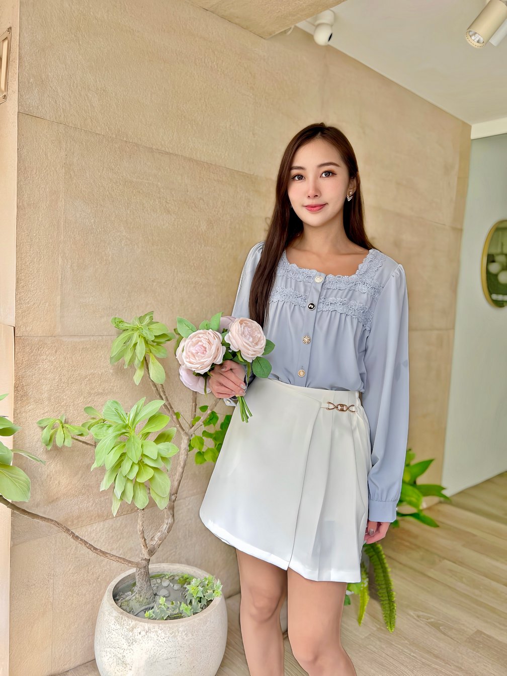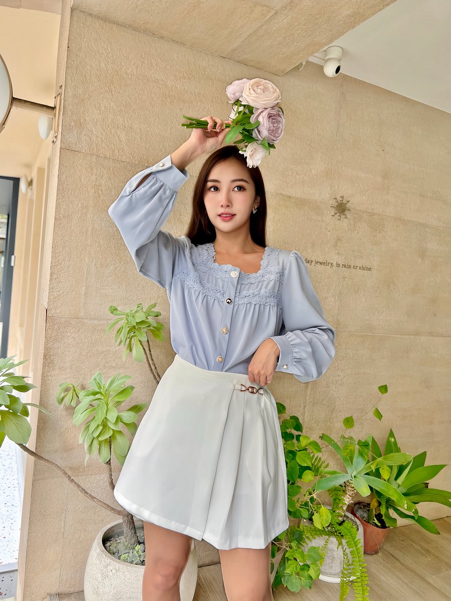 韓國ㄇ字滾蕾絲造型釦雪紡衣